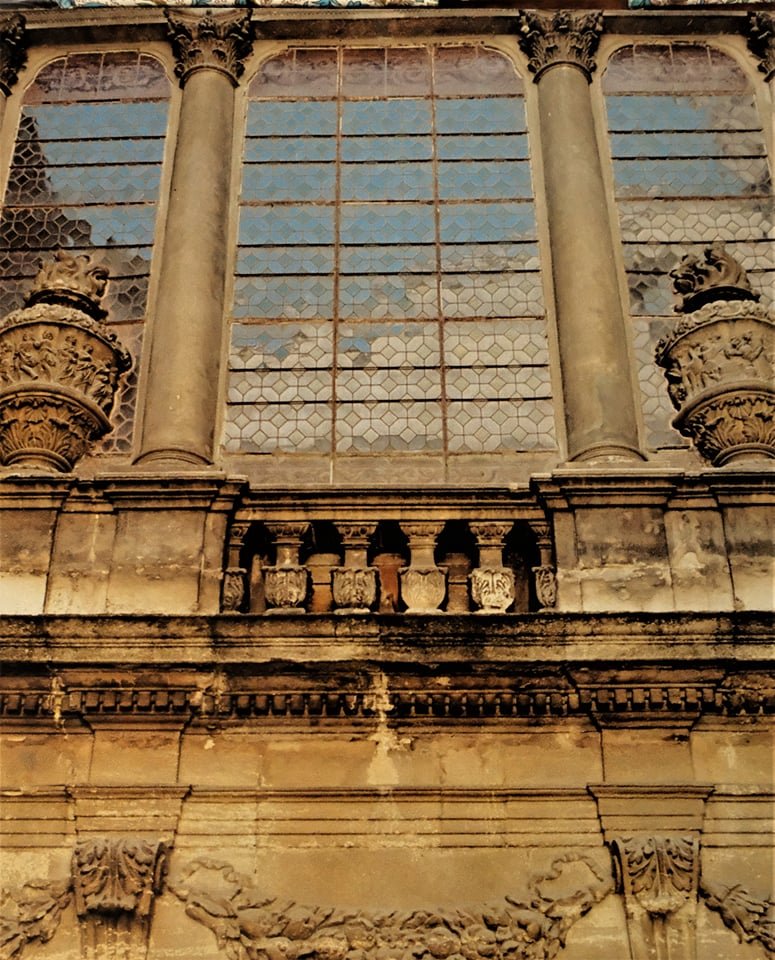 Cette entrée monumentale se compose d’un grand portail à bossages, accosté de pilastres et surmonté d’un puissant fronton en arc segmentaire. Le “tabernacle”, c’est ainsi qu’est dénommé dans le vocabulaire architectural, cette partie qui rompt le fronton, accueille une baie carrée grillagée, elle-même couronnée d’un fronton triangulaire terminé par une boule.