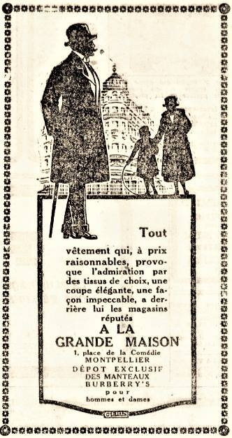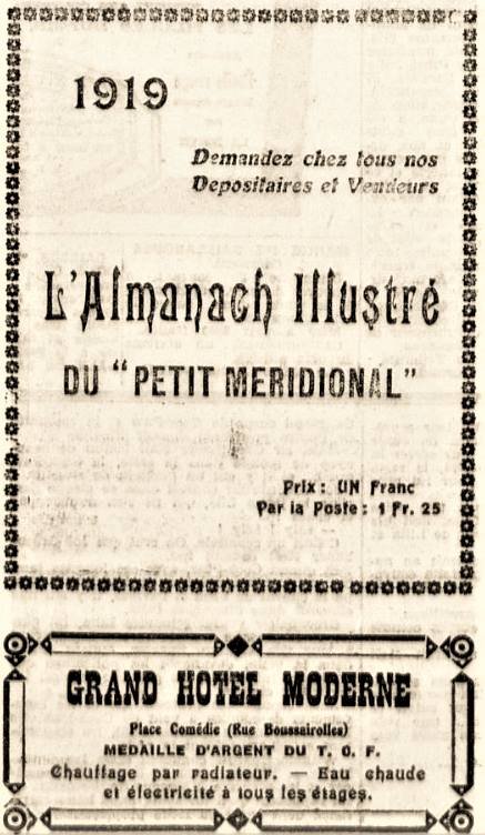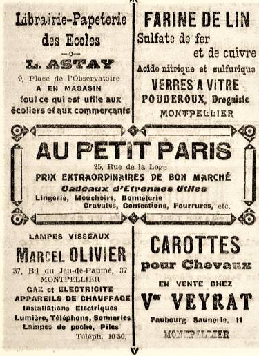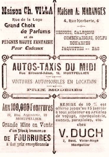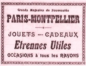Vous pourrez découvrir en faisant défiler les photos qui composent cet album les réclames pour le journal “Le petit Méridional”, mais encore pour les “Nouvelles Galeries”, place de la Comédie, mais aussi la maison “Paris-Montpellier”, rue Maguelone ou la célèbre “Grande Maison” qui occupait l’immeuble formant l’angle de la rue de la Loge et de la place de la Comédie et dont l’enseigne parait le dôme en ardoises.