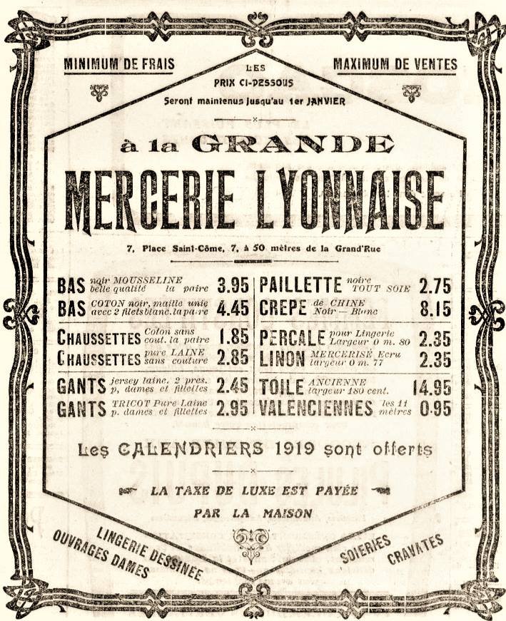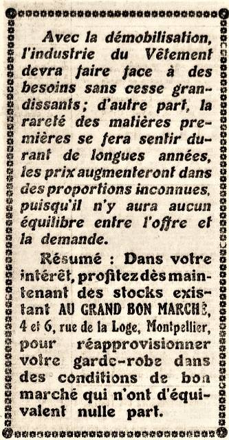 Dans cette parution de la fin de l’année 1918, et plus précisément du 24 décembre, nous retrouvons un panorama assez vaste des commerces de Montpellier. Comme chaque année, à l’approche des étrennes du 1er janvier, les maisons de commerce se livraient une guerre par journaux interposés. Il est évident que ces publicités ne représentent qu’un très faible échantillon de l’activité marchande à Montpellier, en cette période où quelques privations étaient encore sensibles, notamment pour les tissus, dont la production avait été en grande majorité réorientée vers l’approvisionnement des armées.